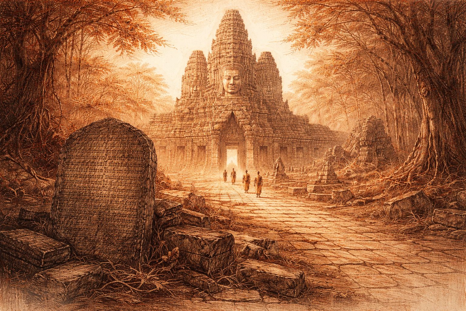 Beneath the silk-cotton roots of Ta Prohm, stone and forest remember one another.