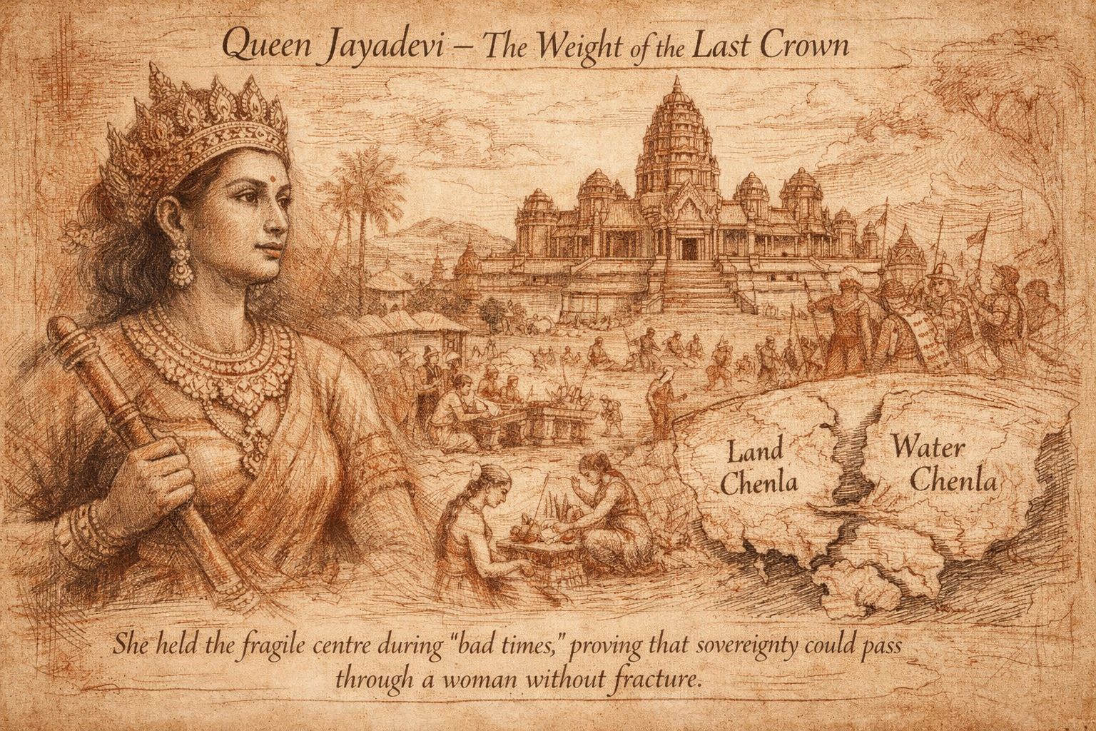 Queen Jayadevi ruled not in triumph, but in tension. Bearing the full title of Holy Lord, she held together a fragile centre during “bad times,” proving that sovereignty could pass through a woman without fracture. When her reign ended, the kingdom loosened—waiting, quietly, for Angkor to rise.