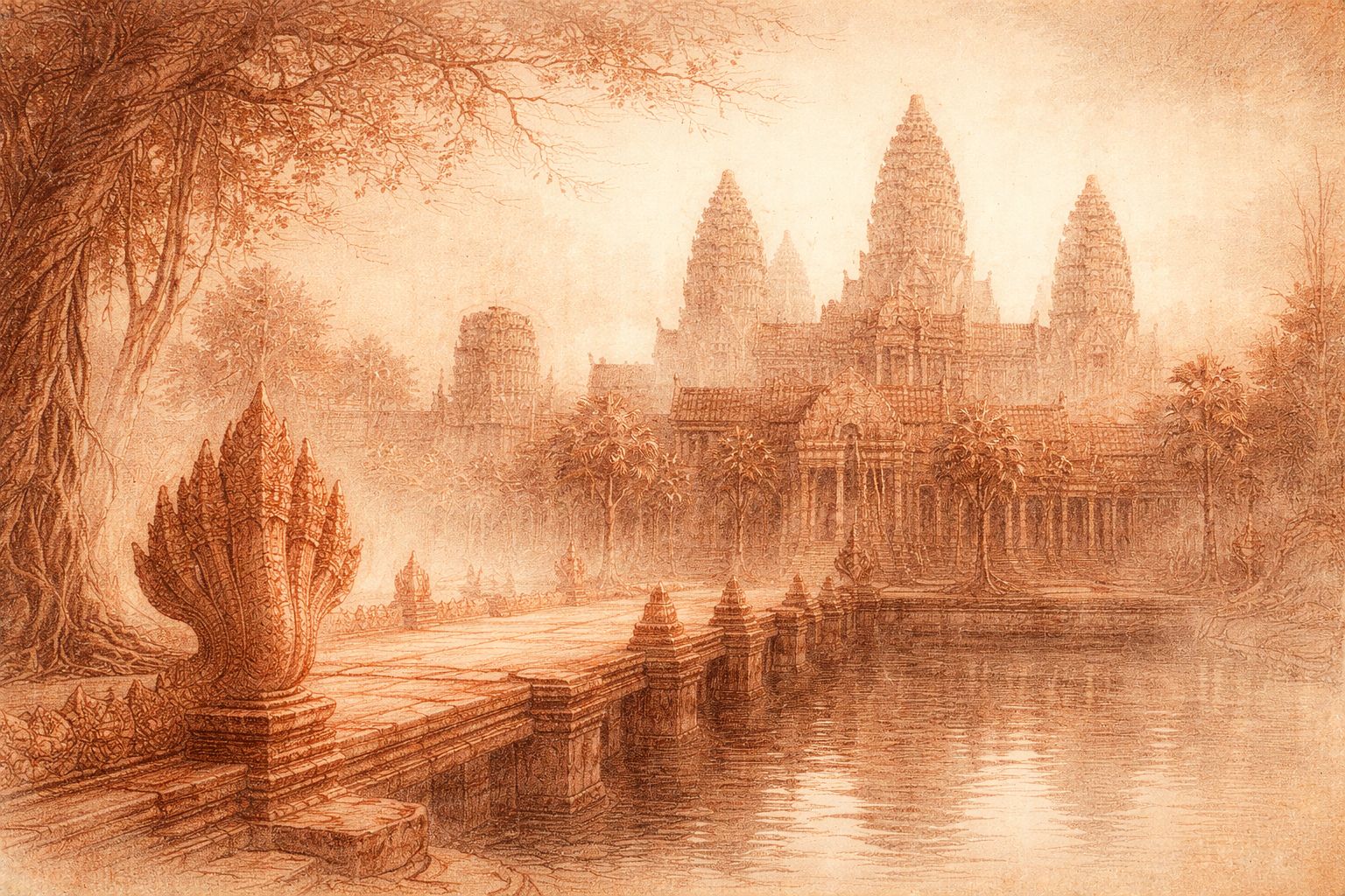 Within these shelves you will find many rooms — journals of Angkor, mythic retellings, meditations on apsaras, and essays on the meaning of sacred stone. Wander chronologically, or enter by theme.