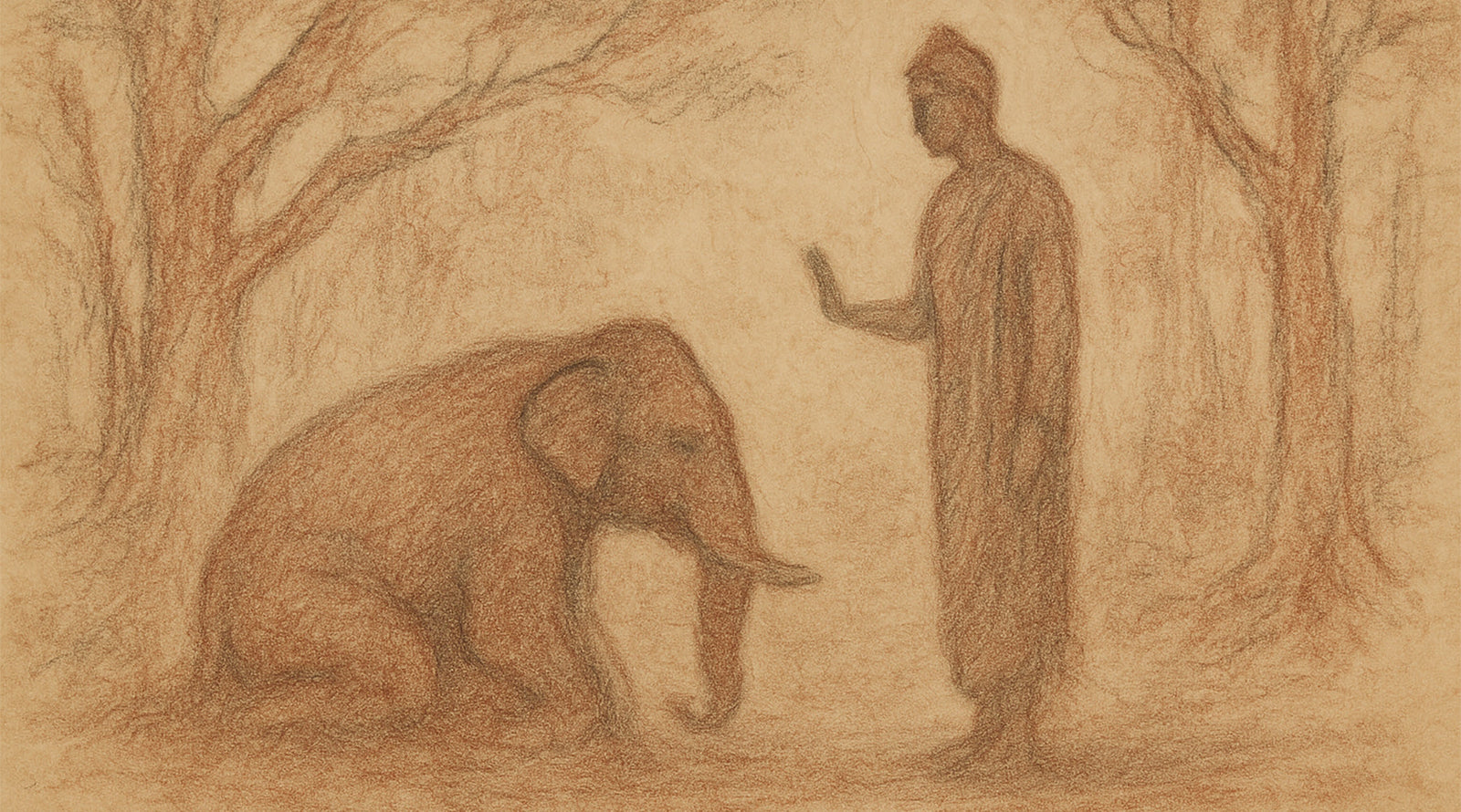 In a forest temple rarely visited, a fierce elephant kneels beneath the Buddha’s hand—carved in stone and veiled by time. This luminous meditation reflects on Theravāda resilience, the Hindu Reaction, and the miracle of wrath transfigured by stillness.