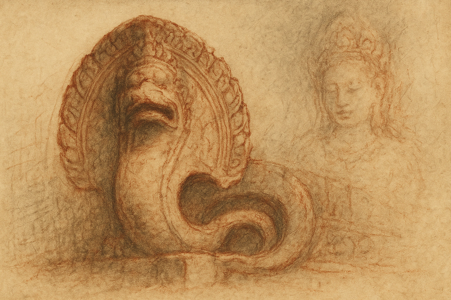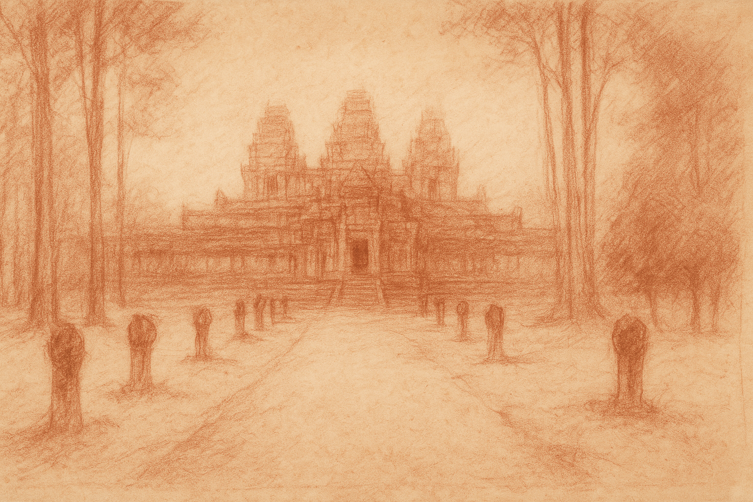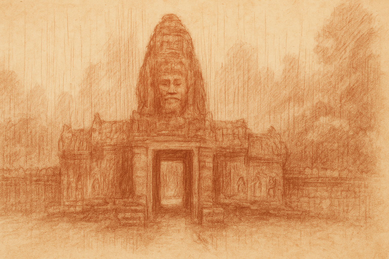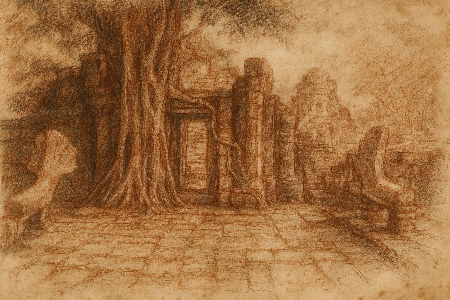 The blue hour settles over Angkor like a hush in stone. Naga coils dissolve into shadow, carvings soften into silence, and hunger without teeth endures. A sketch becomes listening. Each fracture is a hymn, each hollow a river. A field note on patience, memory, and the stillness that lingers.