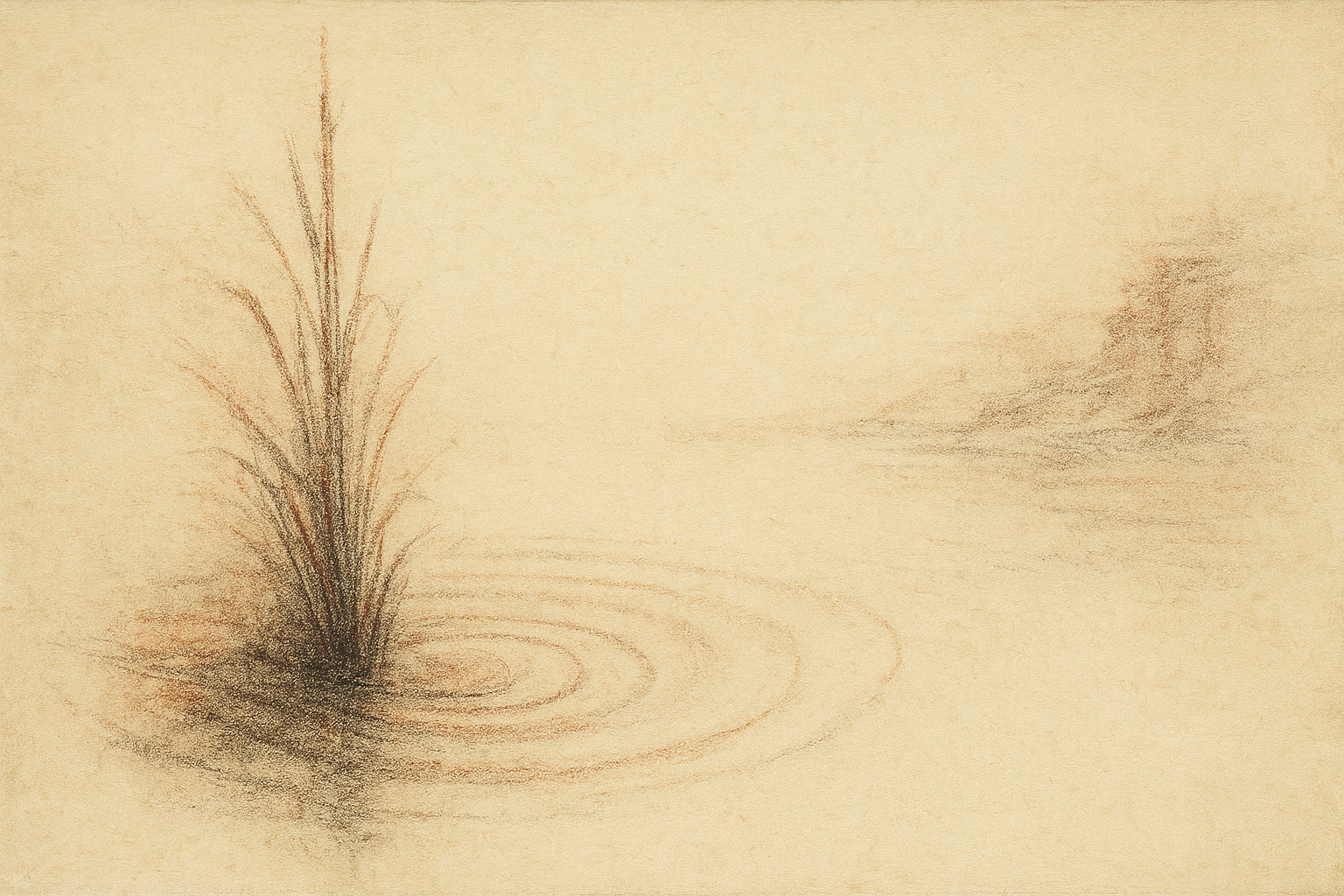 Dusk leans against the bank and the water forgets its hurry. A heron holds one bead of light. In the reeds, someone counts—commas between breaths. The river practises memory; cicadas re-thread a broken necklace. Perhaps art is only this: placing the pause so the note can be heard.