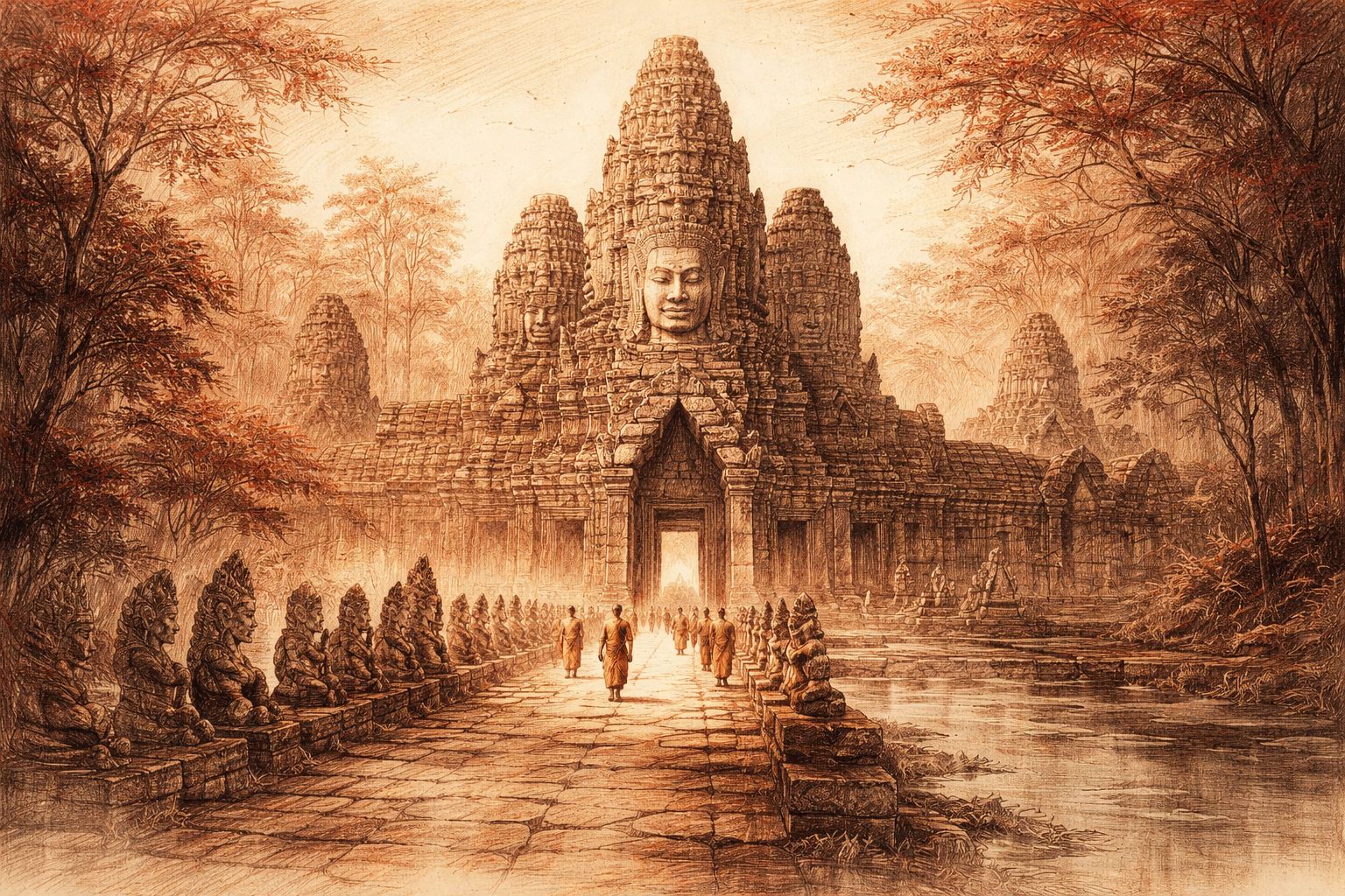 Beneath the gaze of silent stone, two destinies entwine—Khmer and Cham, land and sea, kingship and yearning. Step softly into the Bayon’s breath, where unity flickers like moonlight on water and the ancient dream still waits, murmuring through corridors carved in shadow and light.