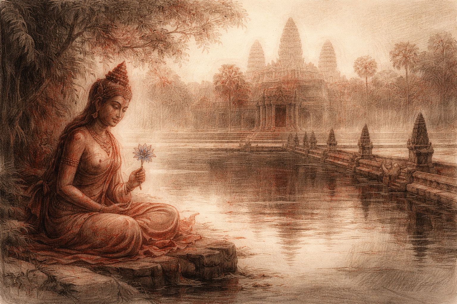 Within these shelves you will find many rooms — journals of Angkor, mythic retellings, meditations on apsaras, and essays on the meaning of sacred stone. Wander chronologically, or enter by theme.