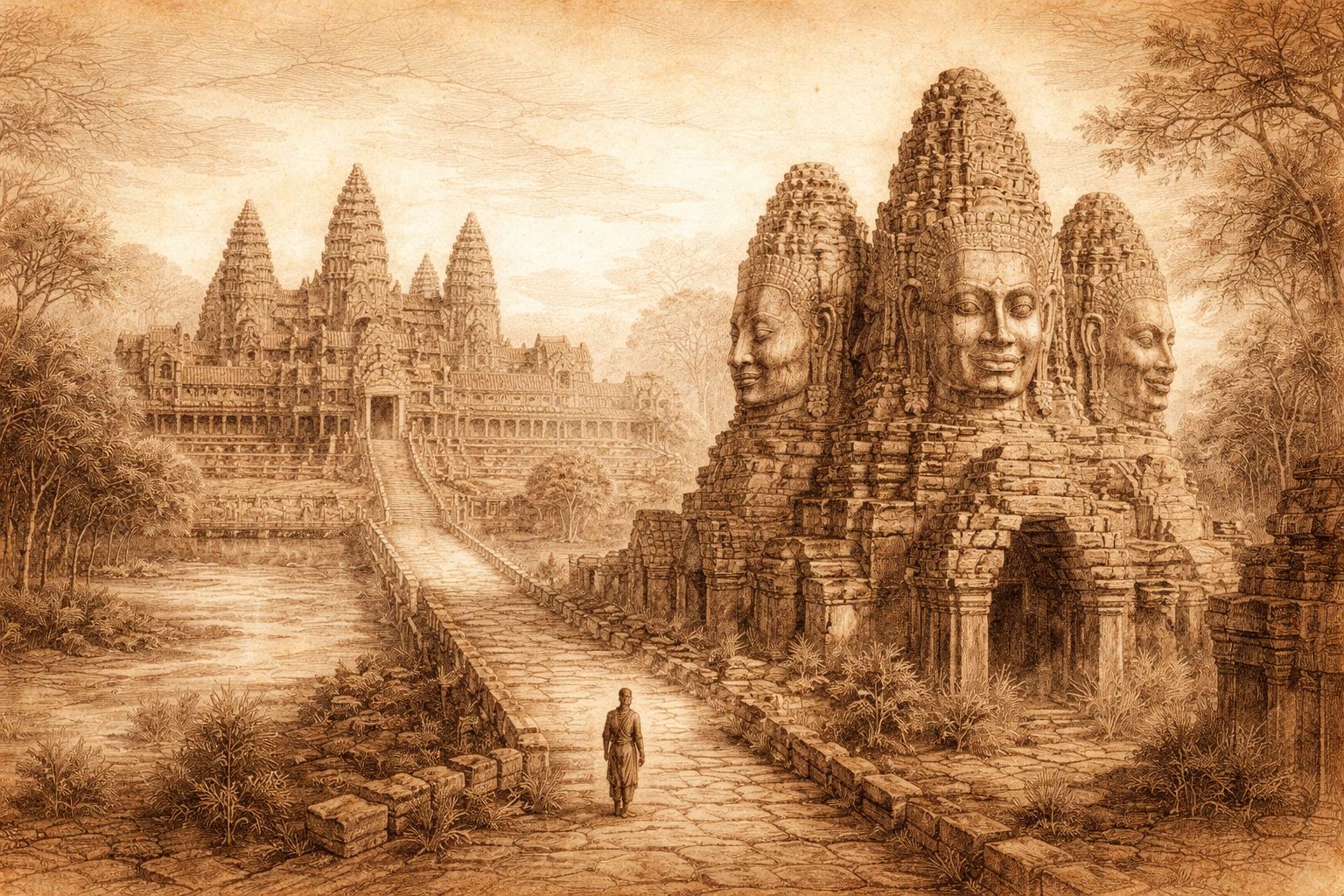 A new vision of kingship rises at the Bayon: serene faces turned to every horizon, shaping a world where authority is expressed as care. Moving through the terraces, one enters a field of steady, compassionate presence — a landscape where stone, light, and time teach through quiet attention.