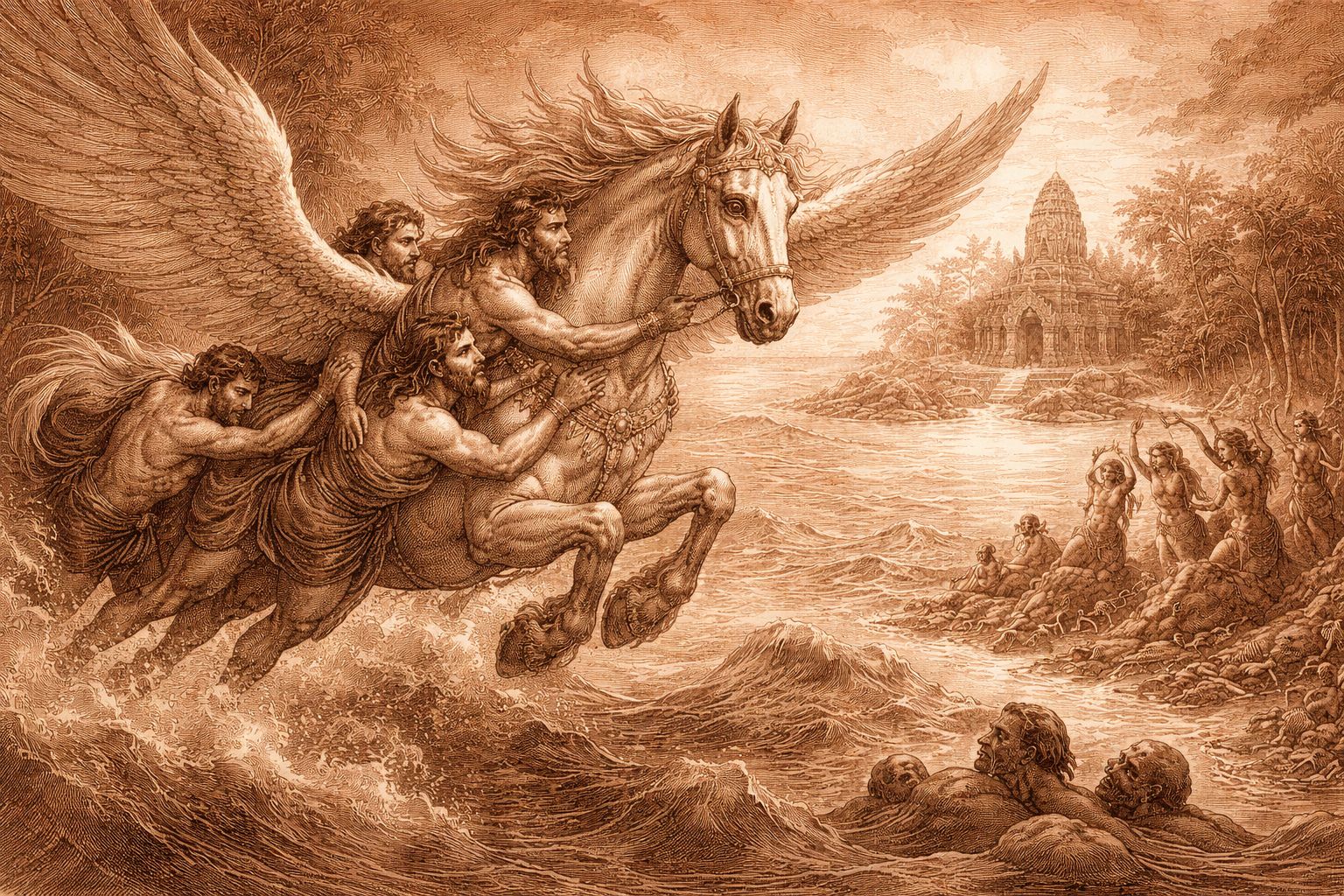Balaha is compassion in motion. Appearing as a flying horse, Lokeshvara becomes the vessel that carries beings across the ocean of existence. Rescue is offered—but only to those who do not look back. In Angkor, this vow was carved into water, stone, and flight.