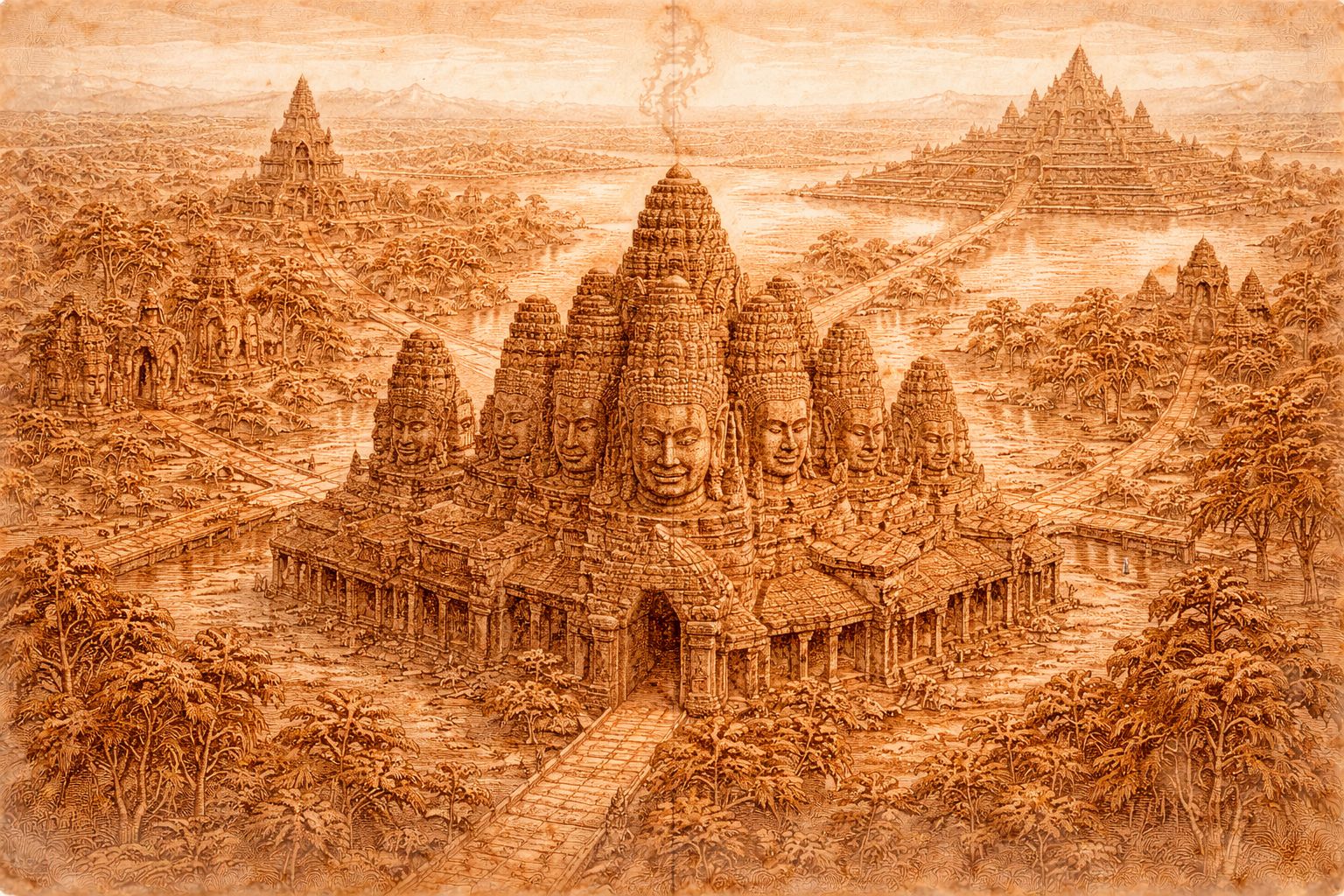 Angkor Wat perfects the universe as law: measured, aligned, and complete. The Bayon answers with presence—faces turned outward, meeting suffering where it stands. Between them, the Khmer mandala does not break; it turns inside out, discovering that order alone is insufficient without compassion.
