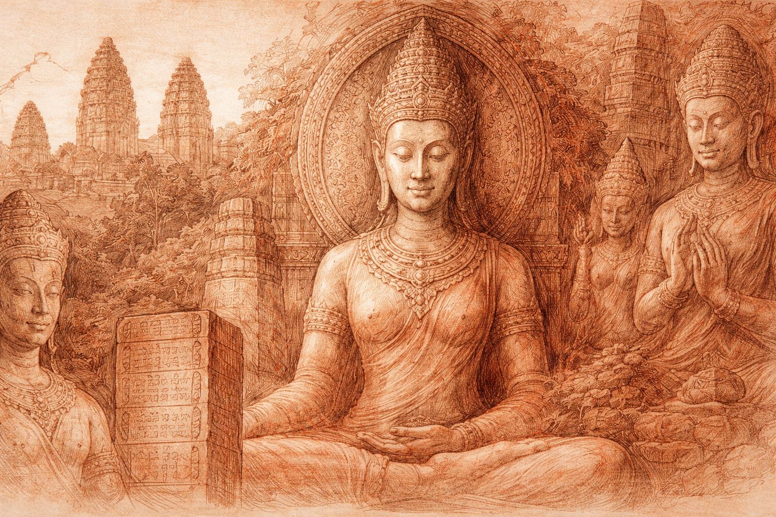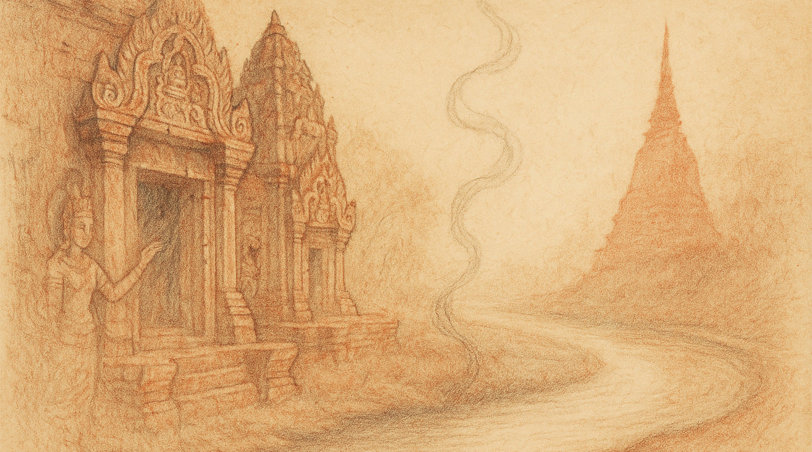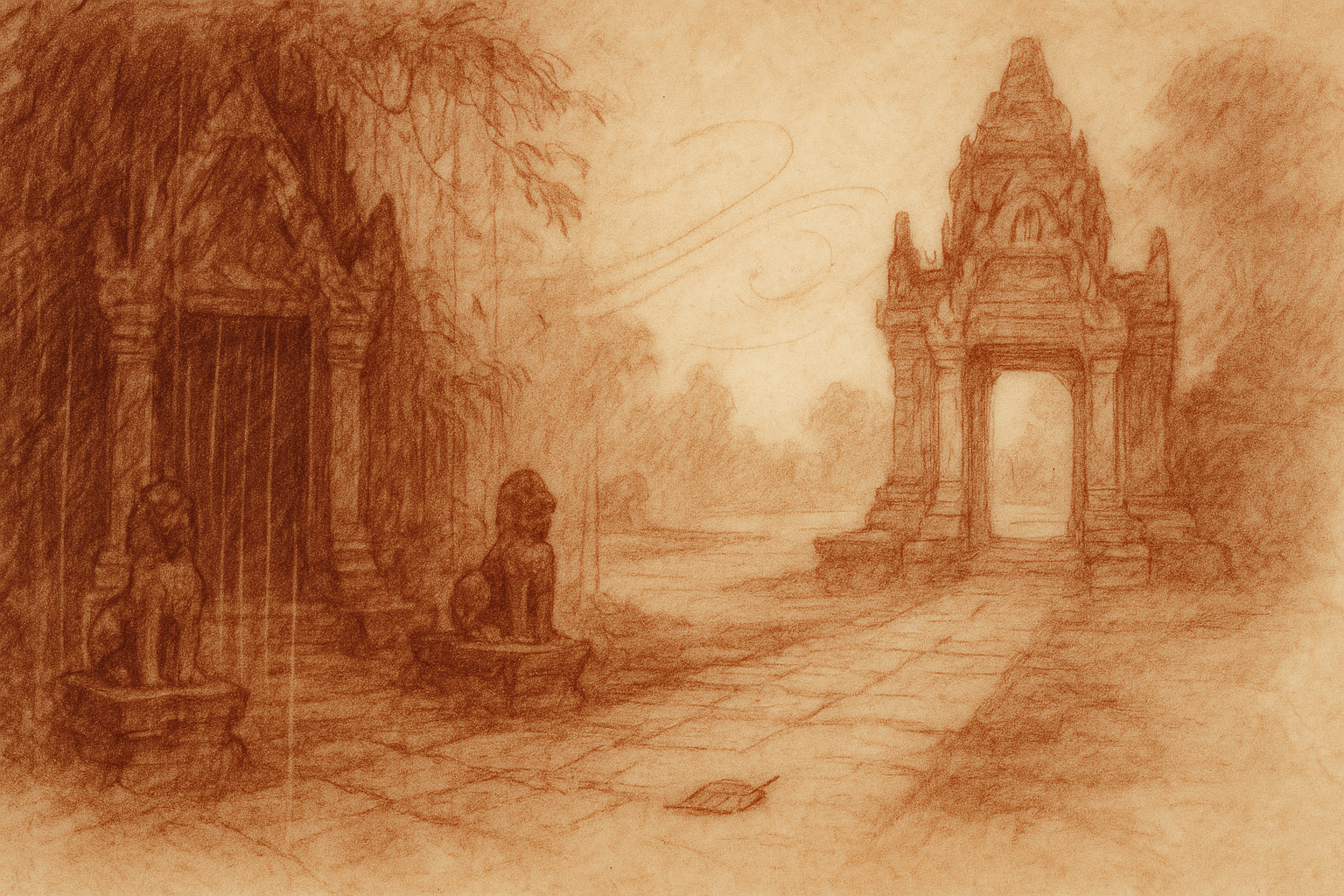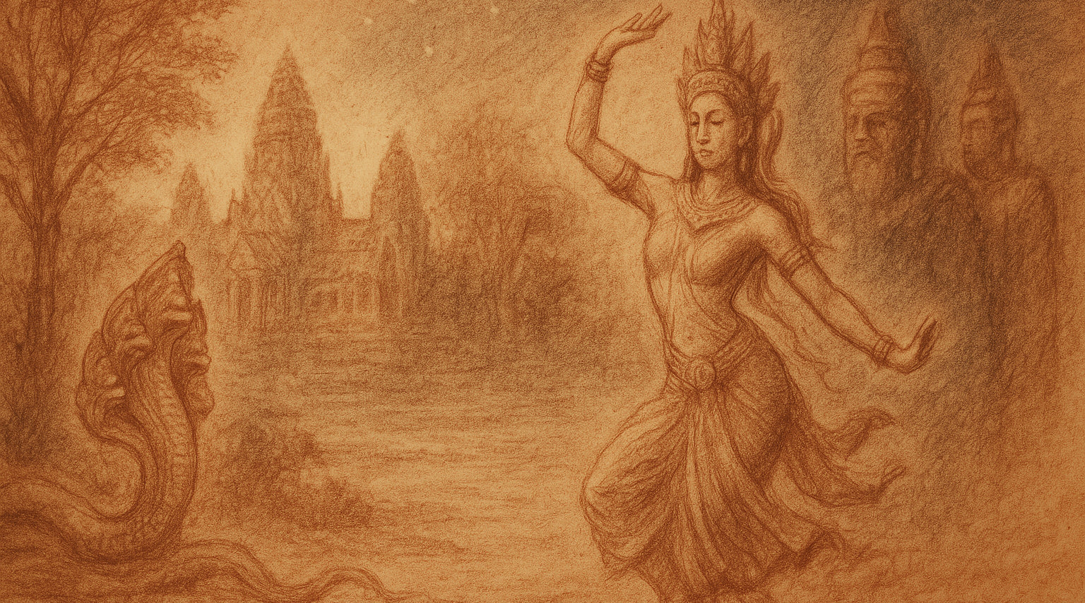 Within these shelves you will find many rooms — journals of Angkor, mythic retellings, meditations on apsaras, and essays on the meaning of sacred stone. Wander chronologically, or enter by theme.