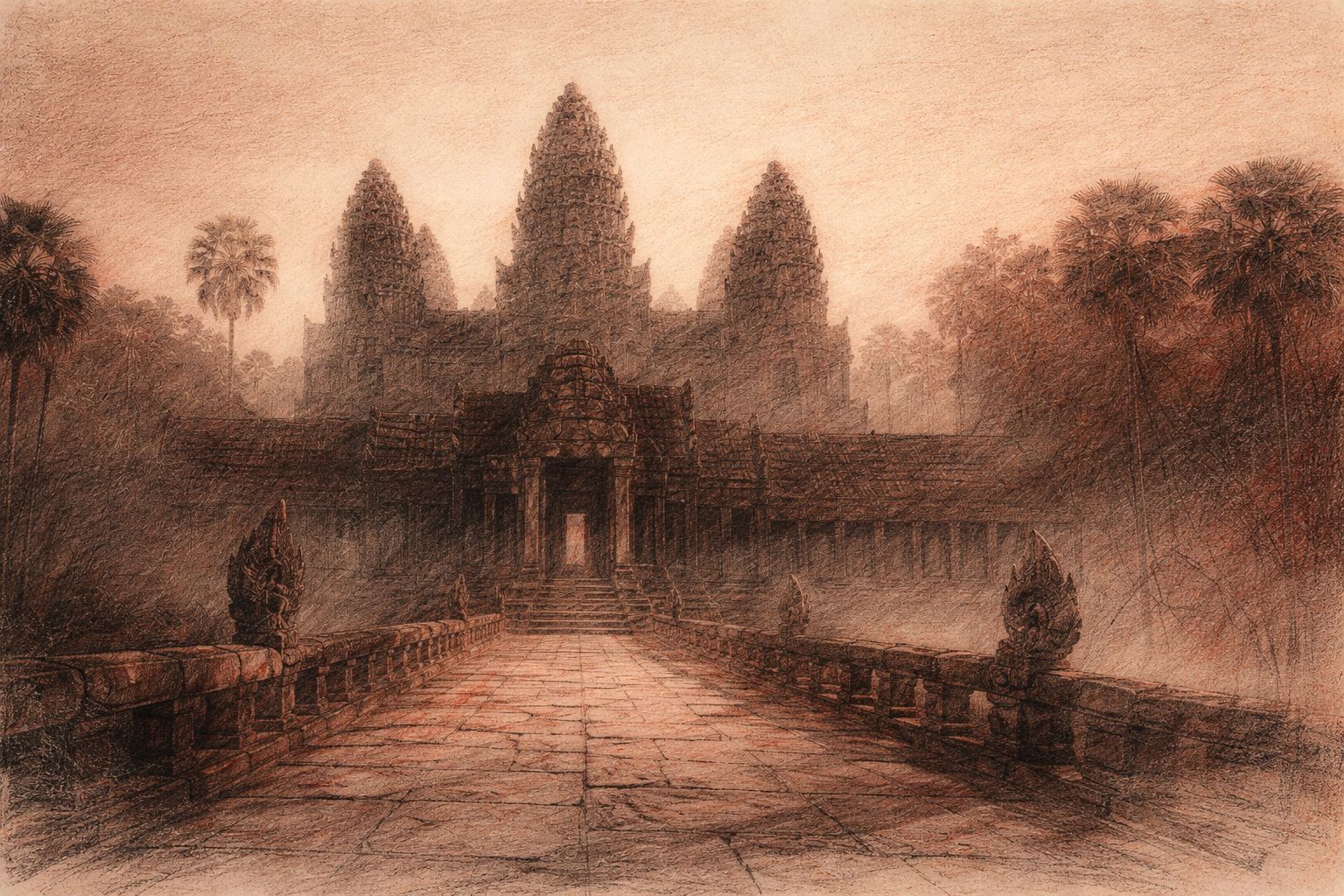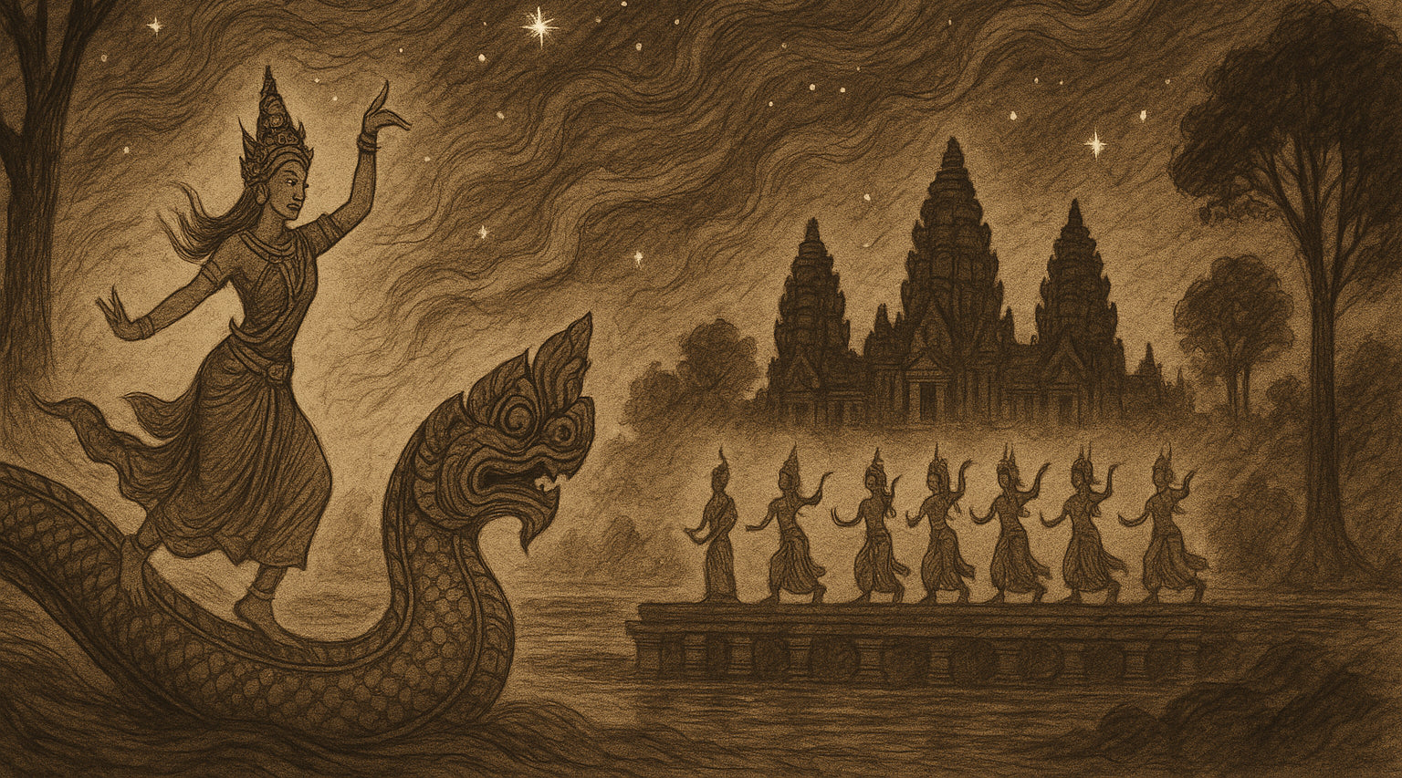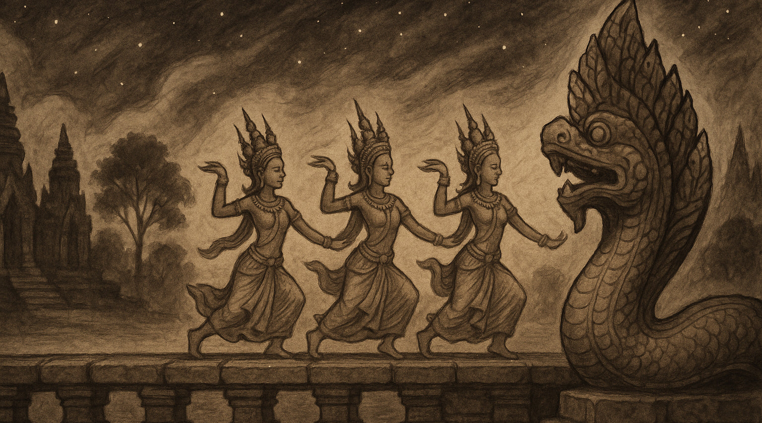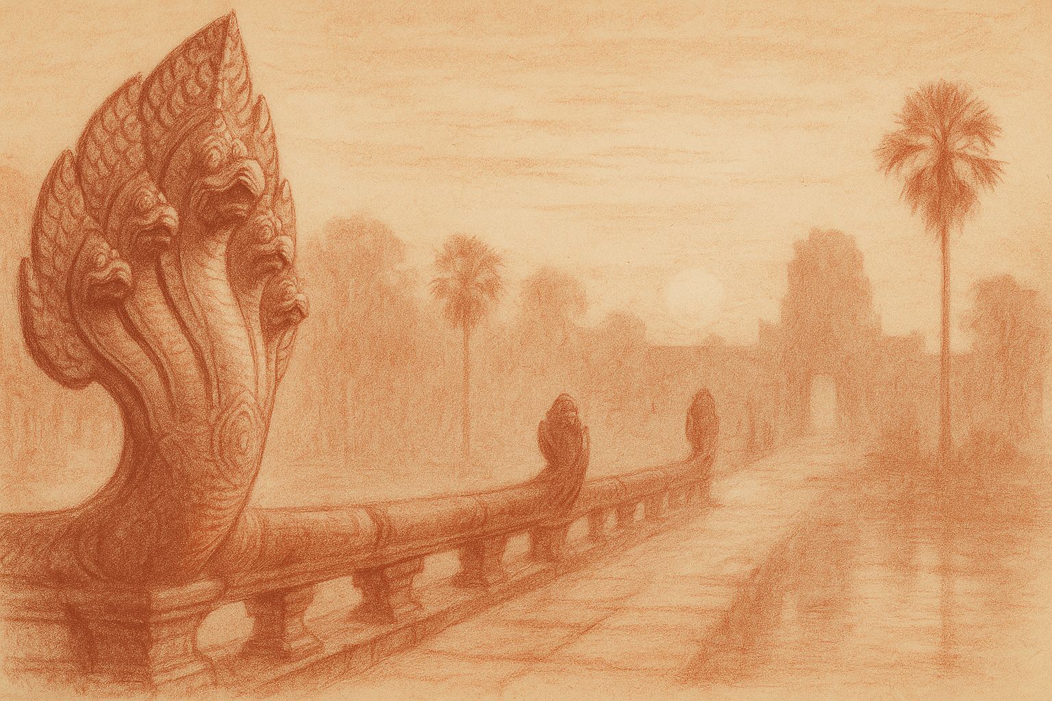Within these shelves you will find many rooms — journals of Angkor, mythic retellings, meditations on apsaras, and essays on the meaning of sacred stone. Wander chronologically, or enter by theme.