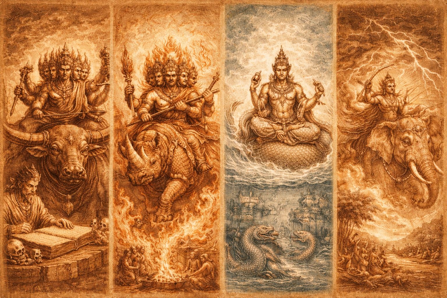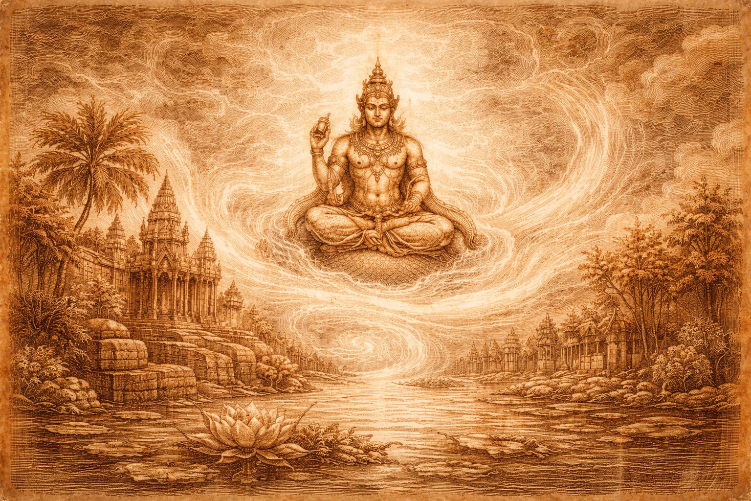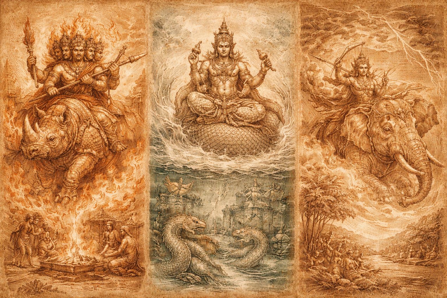 Angkor rests on a triad of restraint. Fire that transforms without excess. Water that binds without drowning. Storm that releases without ruin. Agni, Varuna, and Indra do not contend—they regulate. Between them, heat is housed, rain is timed, and the world is allowed to endure.