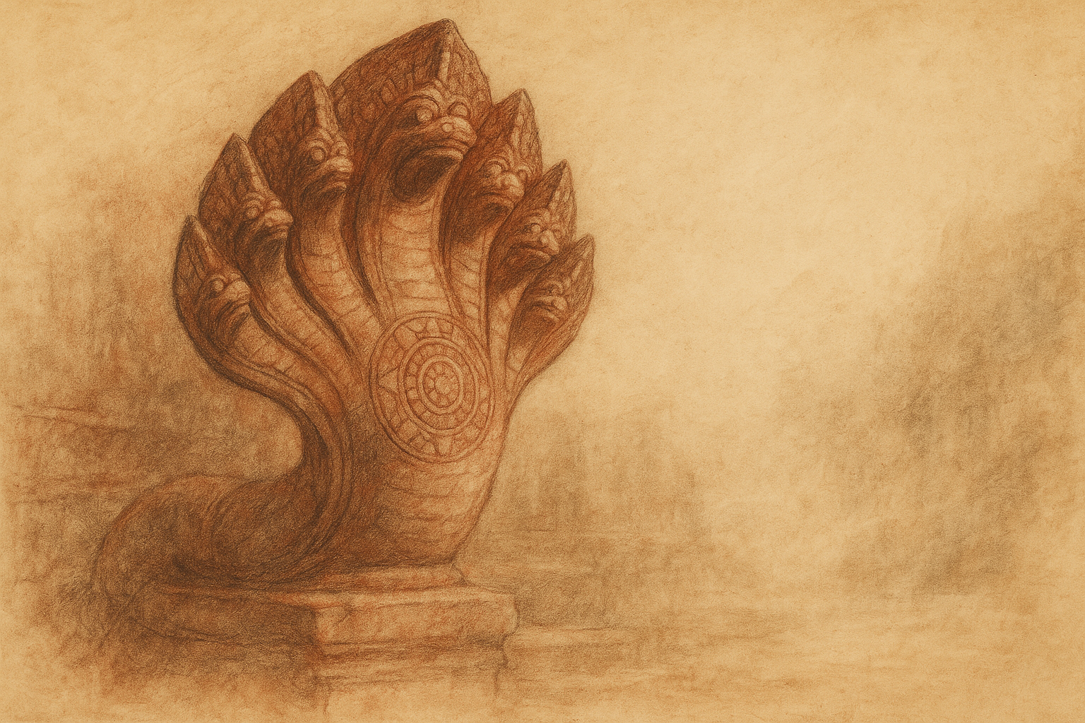 Beneath the serpent’s sheltering heads lies a single sacred shape—etched not for the eyes, but for the spirit. Step quietly into this meditation on stone, stillness, and the forgotten centre that waits within.