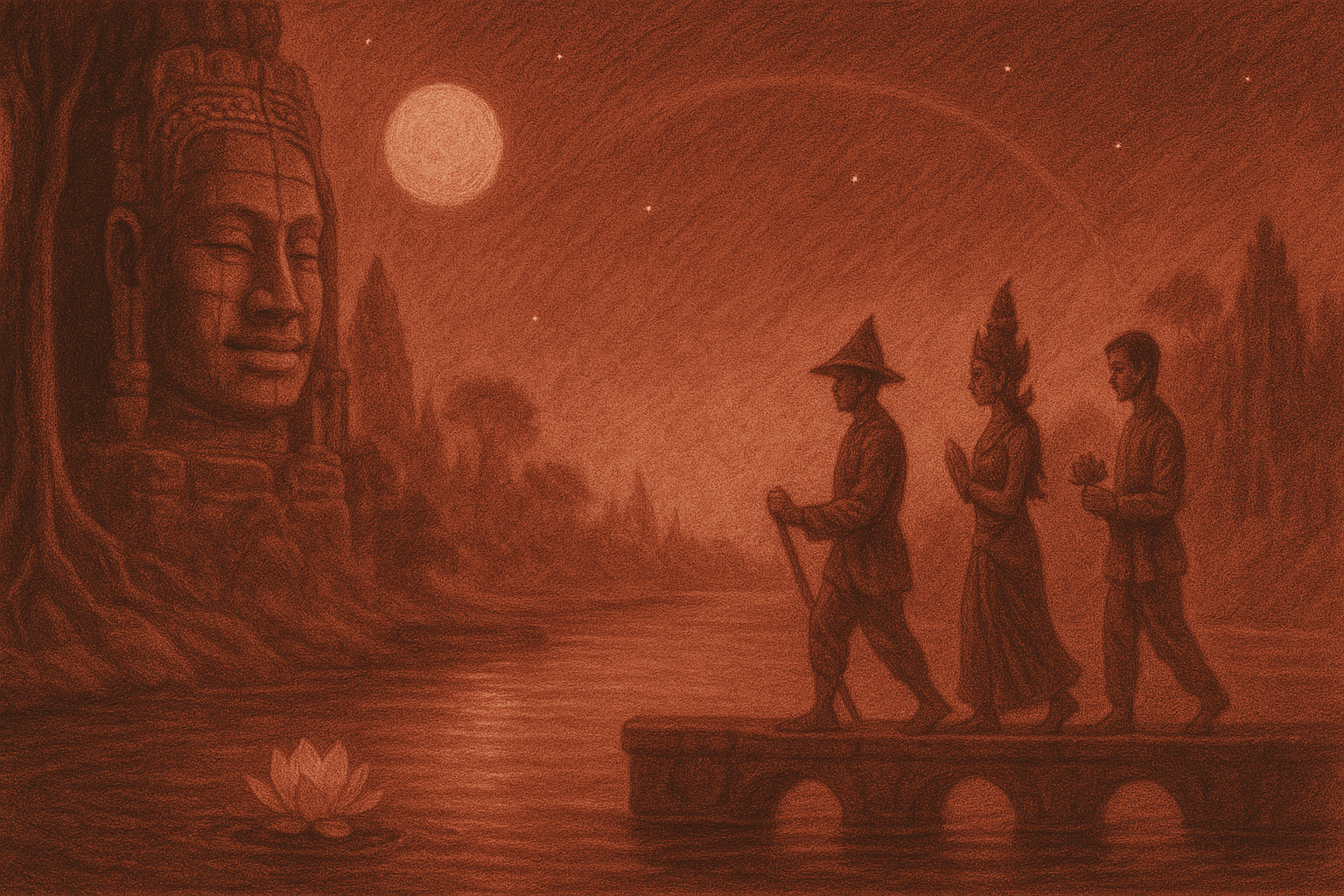 Beneath the gaze of silent stone, two destinies entwine—Khmer and Cham, land and sea, kingship and yearning. Step softly into the Bayon’s breath, where unity flickers like moonlight on water and the ancient dream still waits, murmuring through corridors carved in shadow and light.