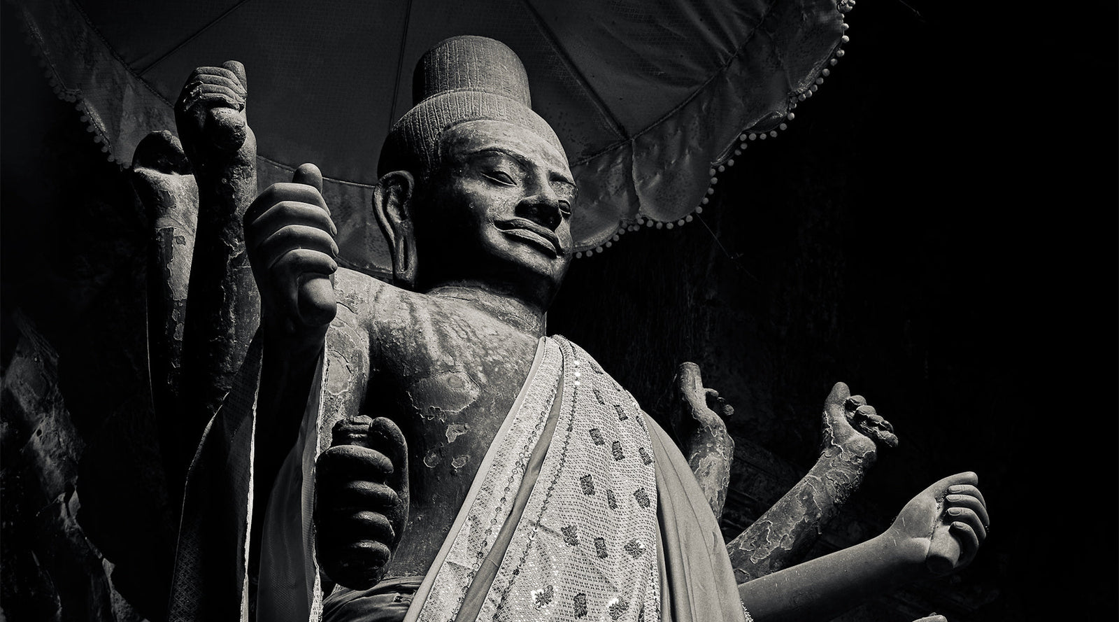 Within Angkor Wat’s western gallery, the fever of Kurukshetra subsides into one luminous gesture. Varro’s hand-toned photograph isolates a warrior poised between breath and release, while a bridge of craft reveals film, exposure, and chiaroscuro as devotional rites. The work invites collectors to stand where myth exhales and stone remembers.